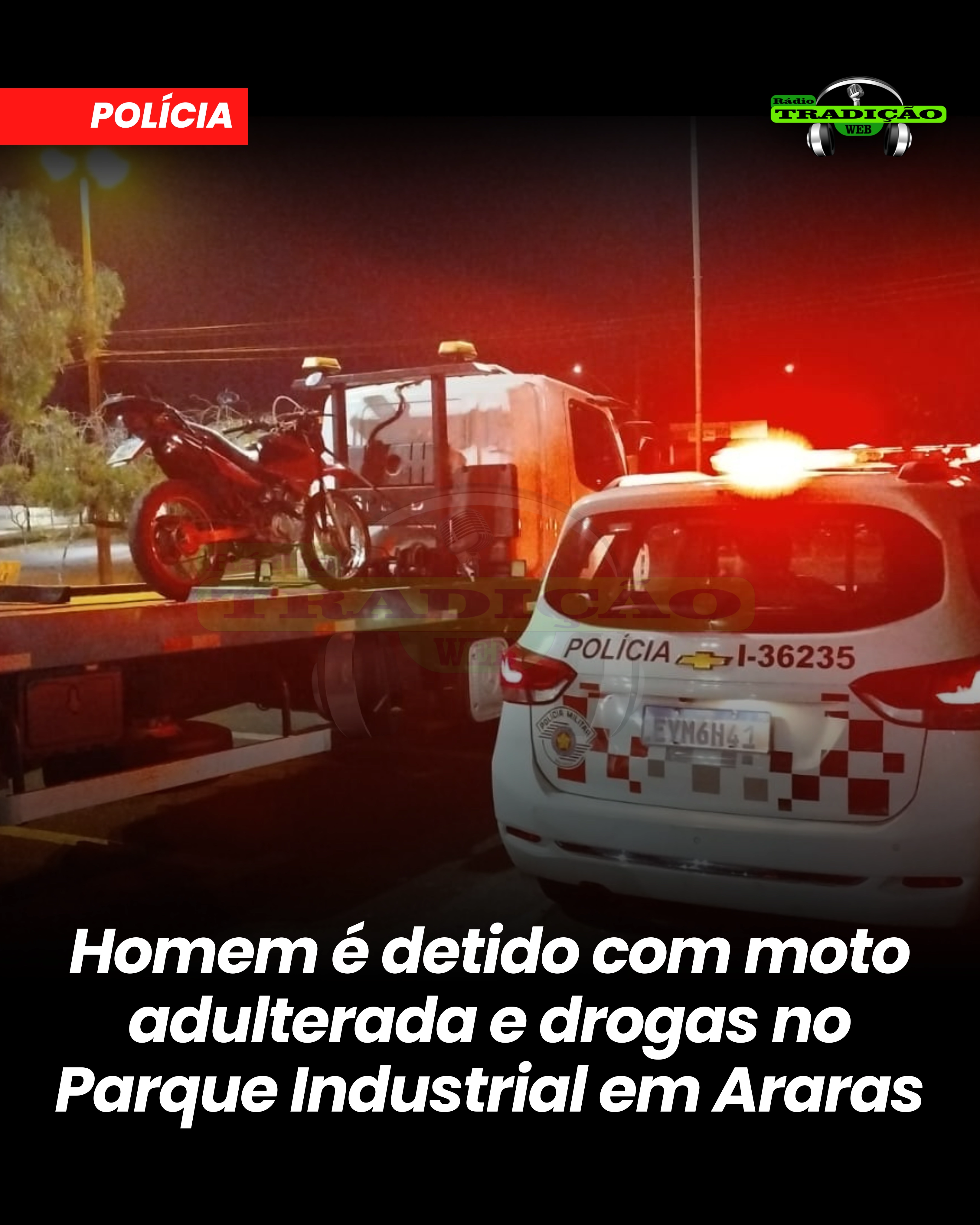 Durante patrulhamento de rotina no Parque Industrial, em Araras (SP), a Polícia Militar abordou um indivíduo que estava em uma motocicleta Honda NXR 125. Na verificação, os policiais constataram que o veículo estava com emplacamento adulterado, o que levantou suspeitas sobre sua procedência.