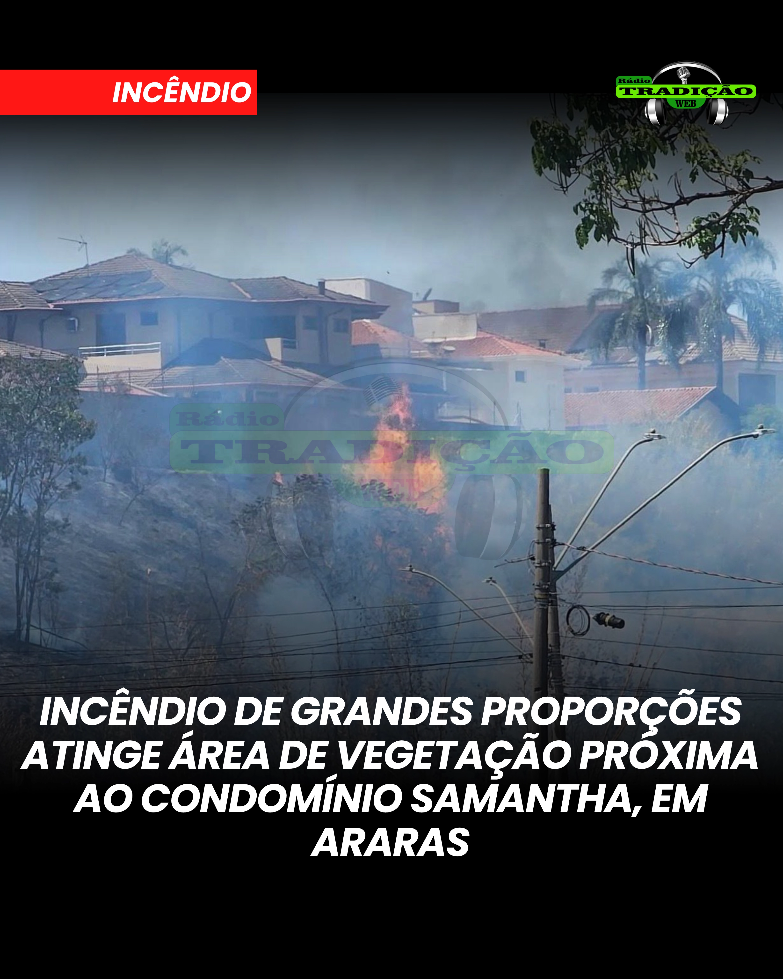 Um incêndio de grandes proporções atingiu a vegetação no entorno do Condomínio Samantha, em Araras, na tarde deste domingo (05).