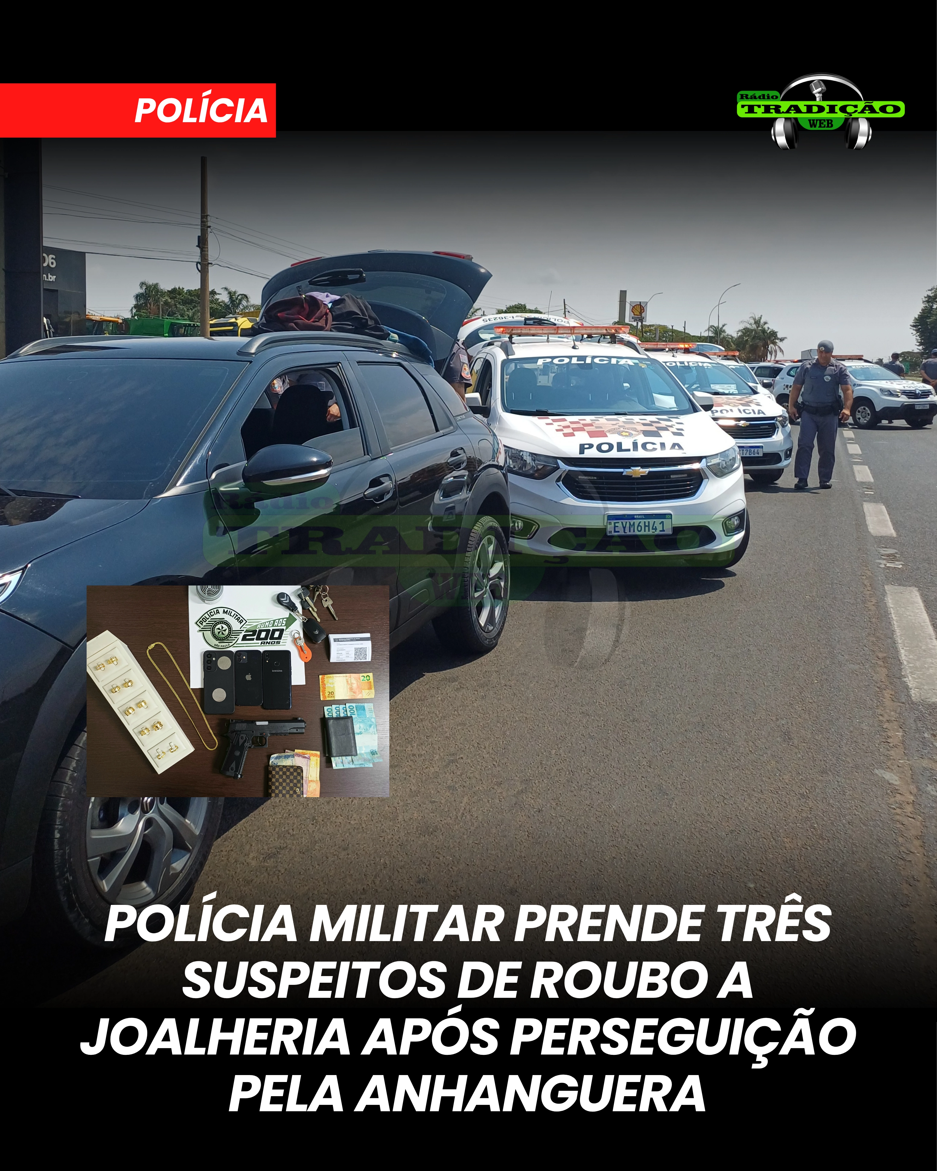 Três homens foram presos em flagrante pela Polícia Militar nesta quarta-feira (8) em um trecho da rodovia Anhanguera em Araras/SP após um assalto a uma joalheria no centro de Leme/SP. De acordo com informações do 36º BPM/I, dois suspeitos entraram na loja e, com uma arma tipo pistola posteriormente identificada como simulacro —, renderam funcionários e roubaram joias e dinheiro. Em seguida, o trio fugiu em um veículo Citroën C4 preto em direção à Rodovia Anhanguera.