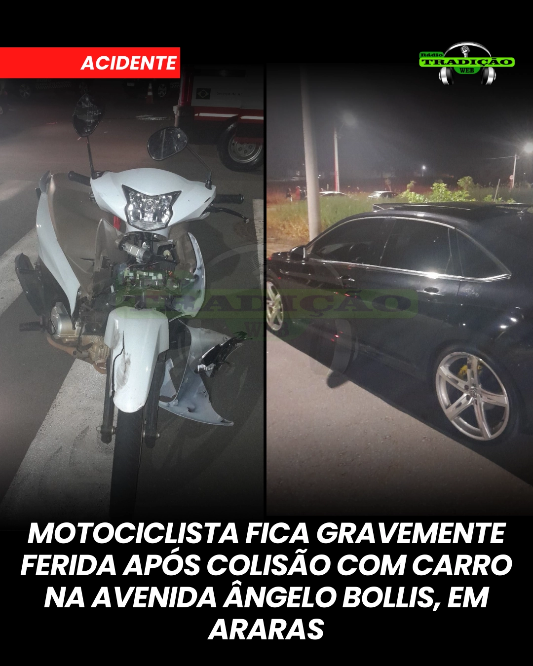 Uma mulher ficou gravemente ferida após um acidente de trânsito registrado na noite deste domingo (11), por volta das 21h42, na Avenida Ângelo Bollis, em Araras (SP). A ocorrência foi atendida pela Guarda Civil Municipal, após acionamento do Centro de Comunicação Operacional (C.COP).