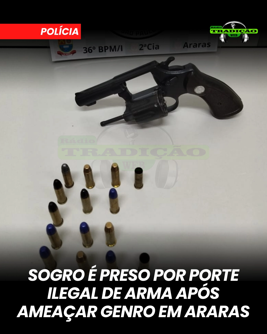Um homem foi preso em flagrante por porte irregular de arma de fogo na noite deste sábado (11), no Parque Tiradentes, em Araras (SP). A ocorrência foi atendida pela Polícia Militar após denúncia de uma desinteligência familiar envolvendo sogro e genro, que terminou em ameaça com uso de arma de fogo.