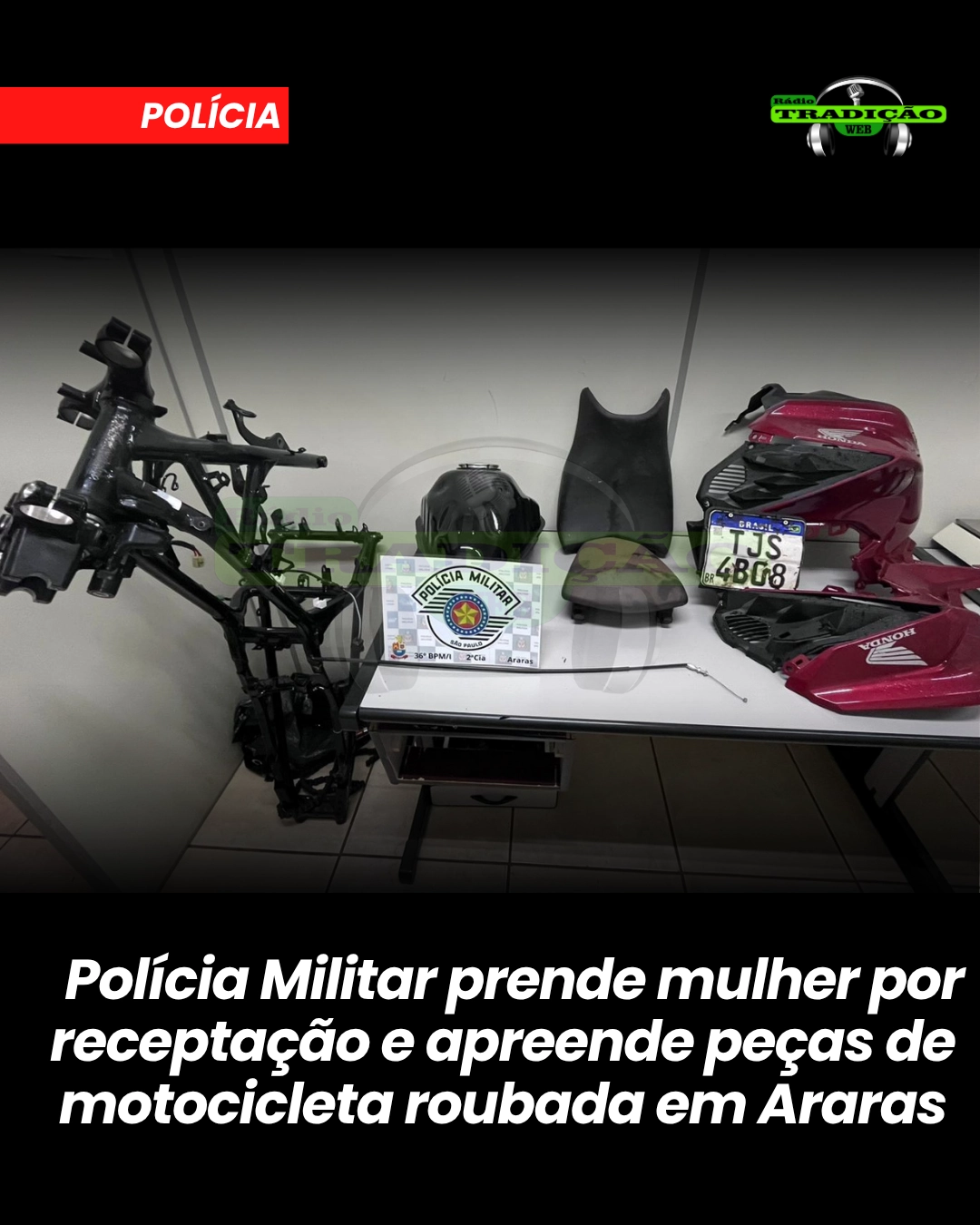 Durante o patrulhamento, a equipe avistou a mulher carregando um quadro de motocicleta embrulhado em uma coberta. Ao realizar a abordagem e verificar o número do chassi por meio do sistema Muralha Paulista, os policiais constataram que o veículo, uma CB 300F Twister vermelha, havia sido roubado em maio de 2025, também em Araras.